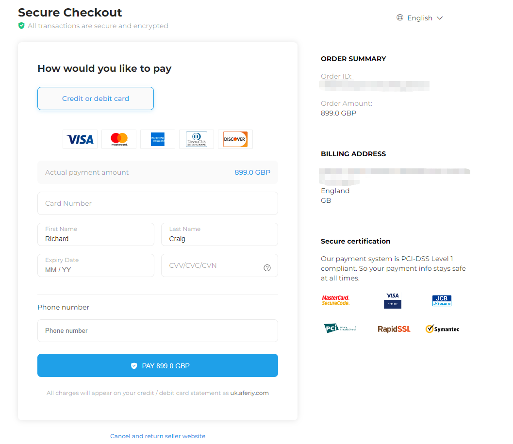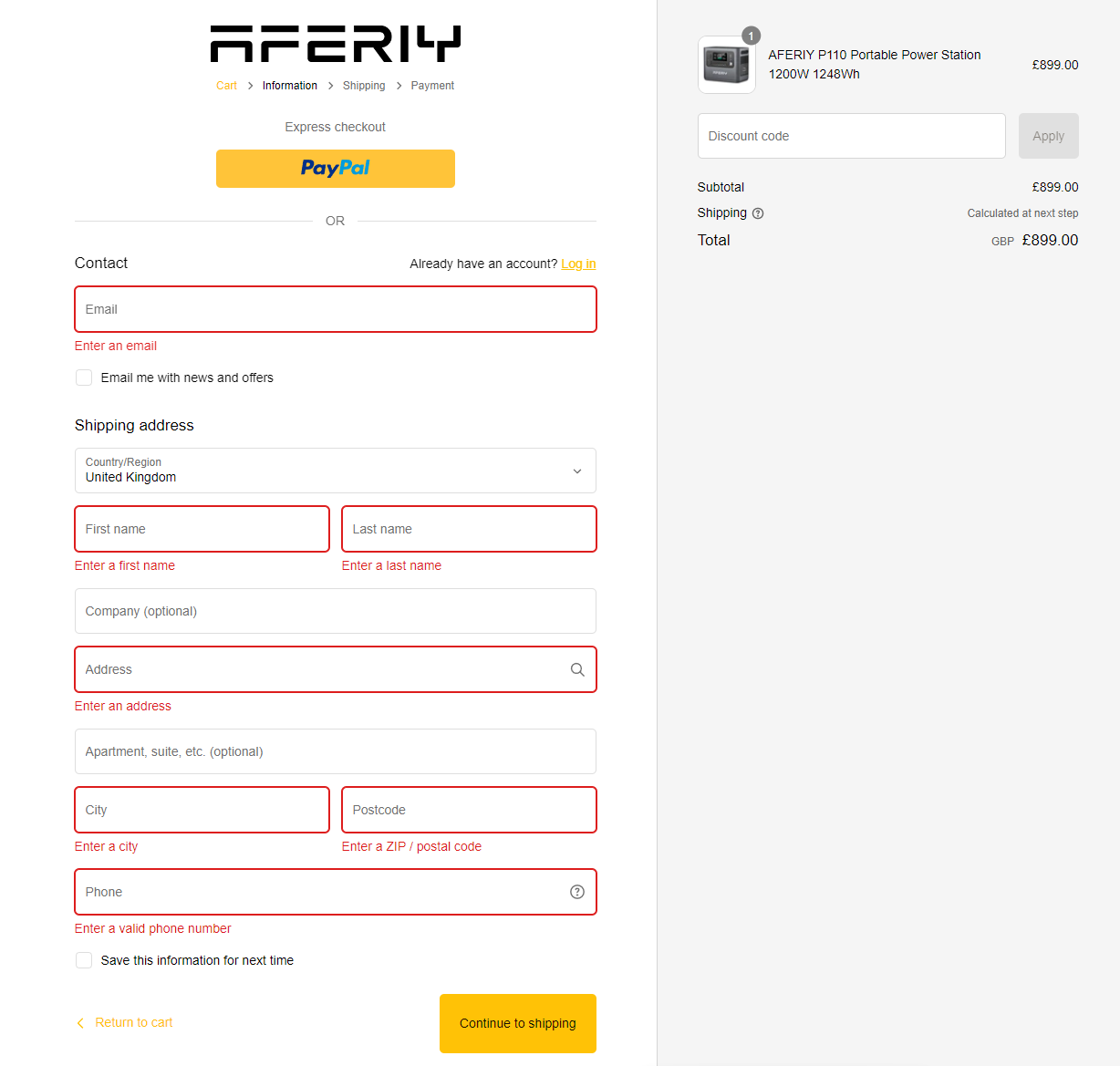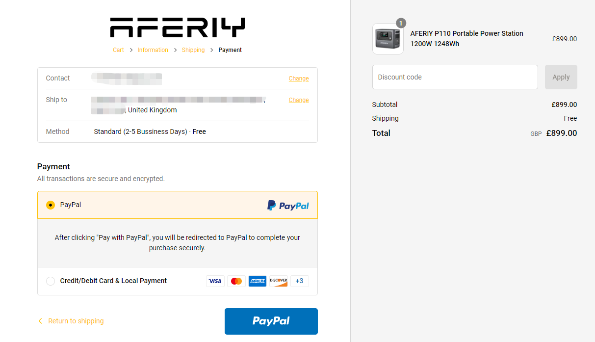 Dit is de aankoopstroom op de officiële Britse website van AFERIY (uk.aferiy.com).